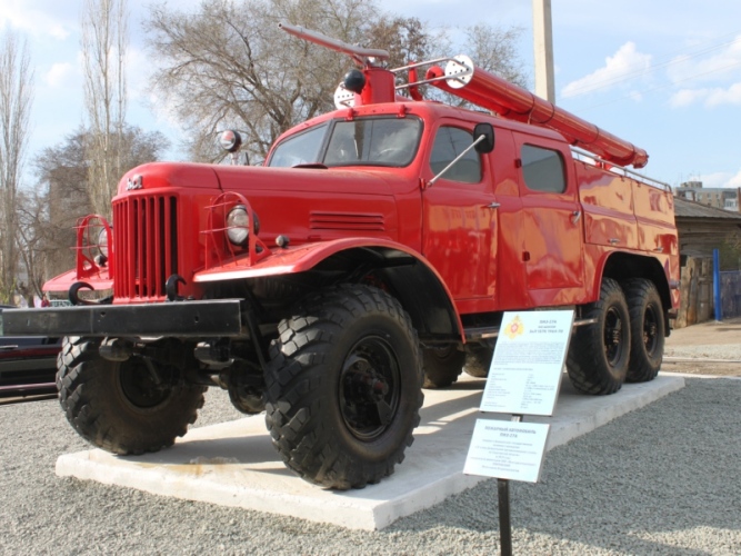 Красующийся на постаменте пожарный автомобиль ПМЗ-27А на базе ЗИЛ-157К 1964-70 – настоящий ветеран своего дела. Выпущенный в 60-х годах прошлого столетия, он и сейчас, по мнению огнеборцев, сможет смело встать на боевое дежурство.