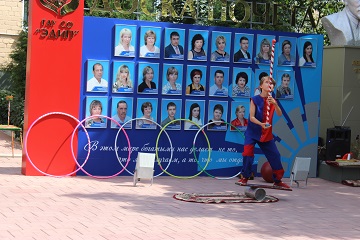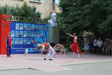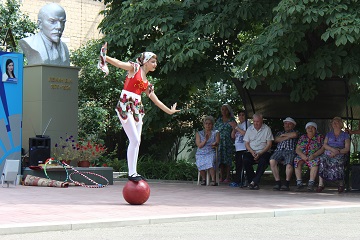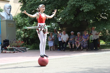 Хозяева встретили гостей на территории, прилегающей к главному входу учреждения. Здесь, в тени раскидистых деревьев, была организована импровизированная площадка для выступления артистов. Проживающие и сотрудники дома-интерната практически в полном составе разместились в ожидании представления. Их ждали зажигательные номера под задорную музыку. С замиранием сердца зрители следили за выступлением девушки-жонглера и юного эквилибриста. А номер «Девушка на шаре» просто заворожил грацией и обаянием красавицы-гимнастки. Иллюзионист не просто демонстрировал ловкость своих рук, а позволил присутствующим поучаствовать в фокусах, ощутить себя чуточку волшебниками. И, конечно же, какой цирк без клоуна. Весельчак клоун Банан заставил зрителей немного пошалить и посмеяться над собой, вовлекая их в свои шутливые проделки.