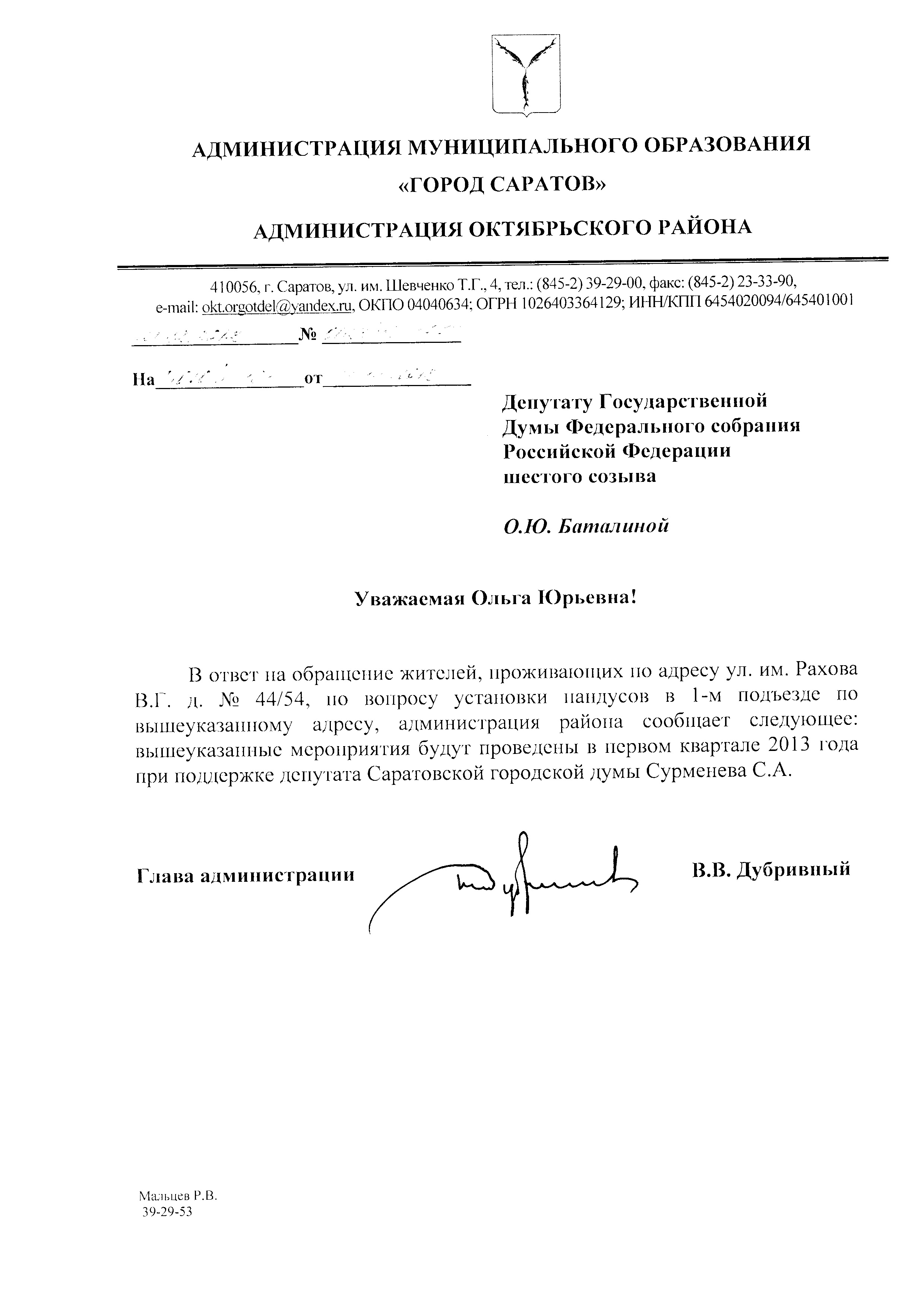 Уважаемая Ольга Юрьевна! Обратиться к Вам заставила следующая история. Мы, жильцы 1-го подъезда по ул Рахова 44/54, просим Вас помочь установить пандус для маленькой девочки Маше 8 лет. Ребенок, инвалид с детства, ей 8 лет. Но ДЦП тяжелой формы и передвижения только на коляске. В нашем подъезде имеется техническая возможность установить пандус. Просим Вас помощь сделать среду доспутной и равные возможности для малышки. Благодарим за помощь.