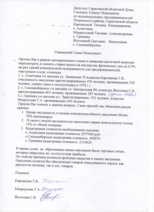 Уважаемый Семен Моисеевич! Просим Вас в рамках антикризисного плана и снижения налоговой нагрузки пересмотреть и снизить ставки налога на имущество физических лиц до 0,5% на ряд зданий коммерческой недвижимости для предпринимателей, торгующих в селе, а именно: 1. с. Асметовка з-е магазин ул. Ленинская 70 владелец Карташова Т.В. (численность населения зарегистрированных 476 человек, проживающих 320 человек, здание сдано в эксплуатацию в 1978 г.) 2. с. Сосновоборское з-е магазин ул. Центральная 89, владелец Жоголева С.В. зарегистрировано 663 человек, проживающих 287 человек. 3.с. Грачевка з-е магазин ул. Зарегистрировано 521 человек, владелец Мокроусова Т.А. проживающих 450 человек. Просим Вас помочь в данном вопросе. Свою просьбу мы объясняем рядом причин: 1. Малая численность и низкая платежеспособность населения (более 70% пенсионеры) 2. В связи с малой численностью населения здания используются только 15% от общей площади. 3. Кадастровые стоимости необоснованно высокие: с. Асметовка кадастровая стоимость 2977000 руб. с.Сосновоборское кадастровая стоимость 695670 с. Грачевка кадастровая стоимость 2110620 В наших селах до образования наших магазинов были торговые точки, которые закрылись из- за отсутствия прибыли. По этой же причине возникла проблема закрытия и наших магазинов. Население остается без обеспечения товаров повседневного спроса, как продуктов питания, так и хоз. товаров.