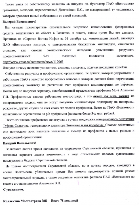 Открытое письмо губернатору Саратовской области Радаеву В. В. от коллектива Мостоотряда №8