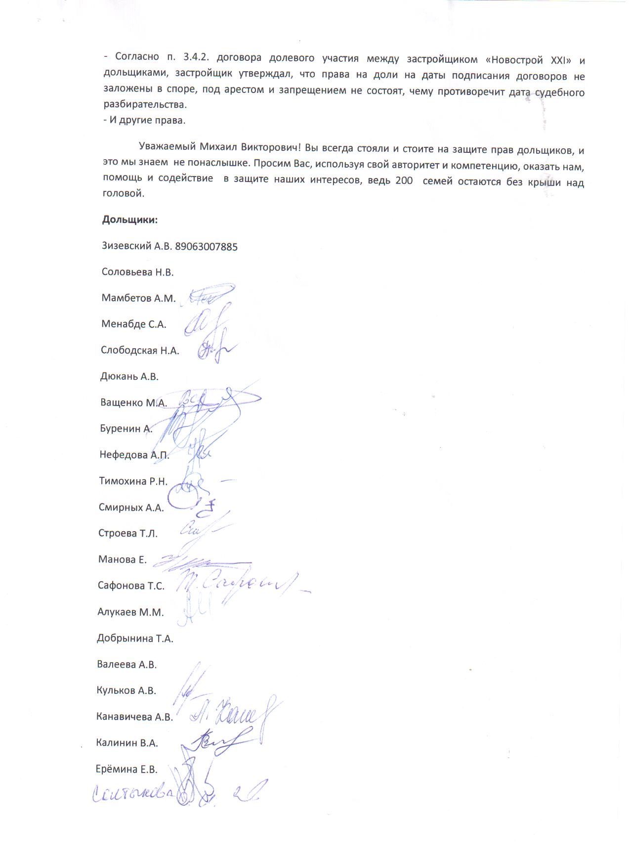 Уважаемый Михаил Викторович! Вы всегда стояли и стоите на защите прав дольщиков, и это мы знаем не понаслышке. Просим Вас, используя свой авторитет и компетенцию, оказать нам, помощь и содействие в защите наших интересов, ведь 200 семей остаются без крыши над головой.