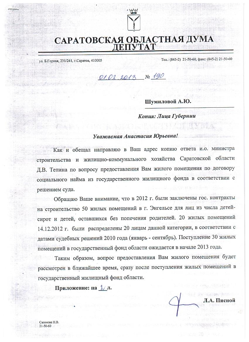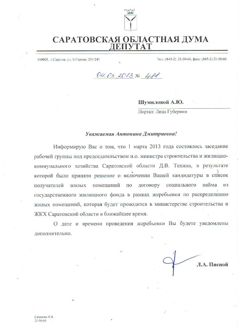 Анастасия написала много сообщений на личные странички политиков и чиновников Саратовской области и только двое из них отреагировали на мольбы сироты: Николай Панков, Член Президиума Генерального совета Партии и Леонид Писной, депутат Саратовской областной Думы.