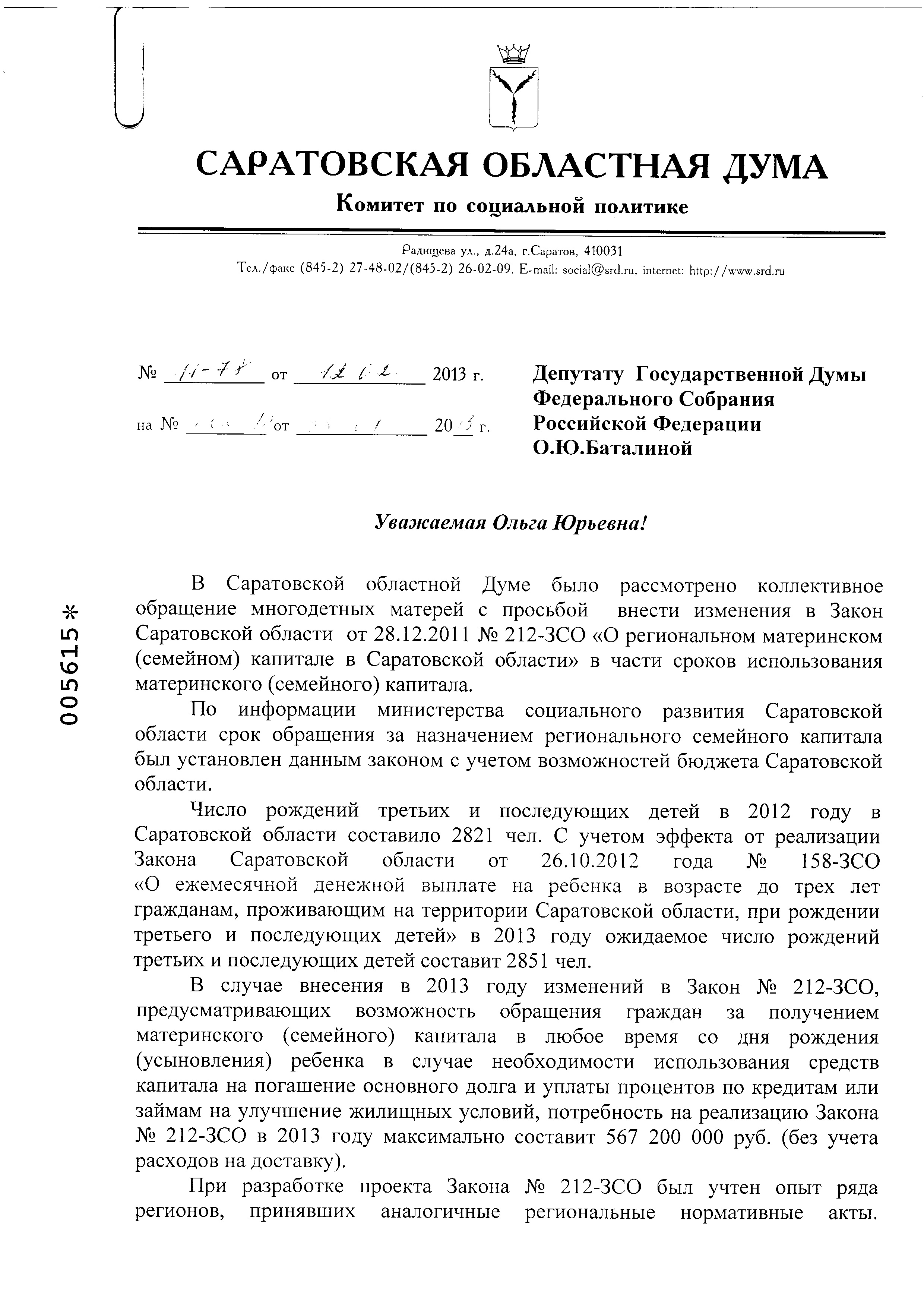 Уважаемая Ольга Юрьевна, в июле 2012г. я задавала вам вопрос о возможности внесения изменений в Областной закон Саратовской области о региональном материнском (семейном) капитале, в частности, о принятии поправки в закон в части срока получения материнского капитала с целью погашения кредита на улучшение жилищных условий с момента рождения ребенка, не дожидаясь 3-х летнего возраста (как в Федеральном Законе о материнском капитале). Вы мне ответили, что данное предложение взято для внимательного изучения депутатами Саратовской областной думы. Хотелось бы узнать, рассматривали ли депутаты данный вопрос и было ли принято решение? С Уважением, Надежда