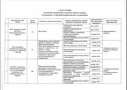 Кроме того, Вами был предоставлен план-график мероприятий по решению проблем граждан, пострадавших от недобросовестных застройщиков. Первым в этом плане стоял дом 5 ЖСК «Свой дом», чьи проблемы должны были быть решены теперь уже к октябрю 2015 года (до этого 7 лет (!!!) многострадальный дом кочевал из одного плана в другой с новыми датами).