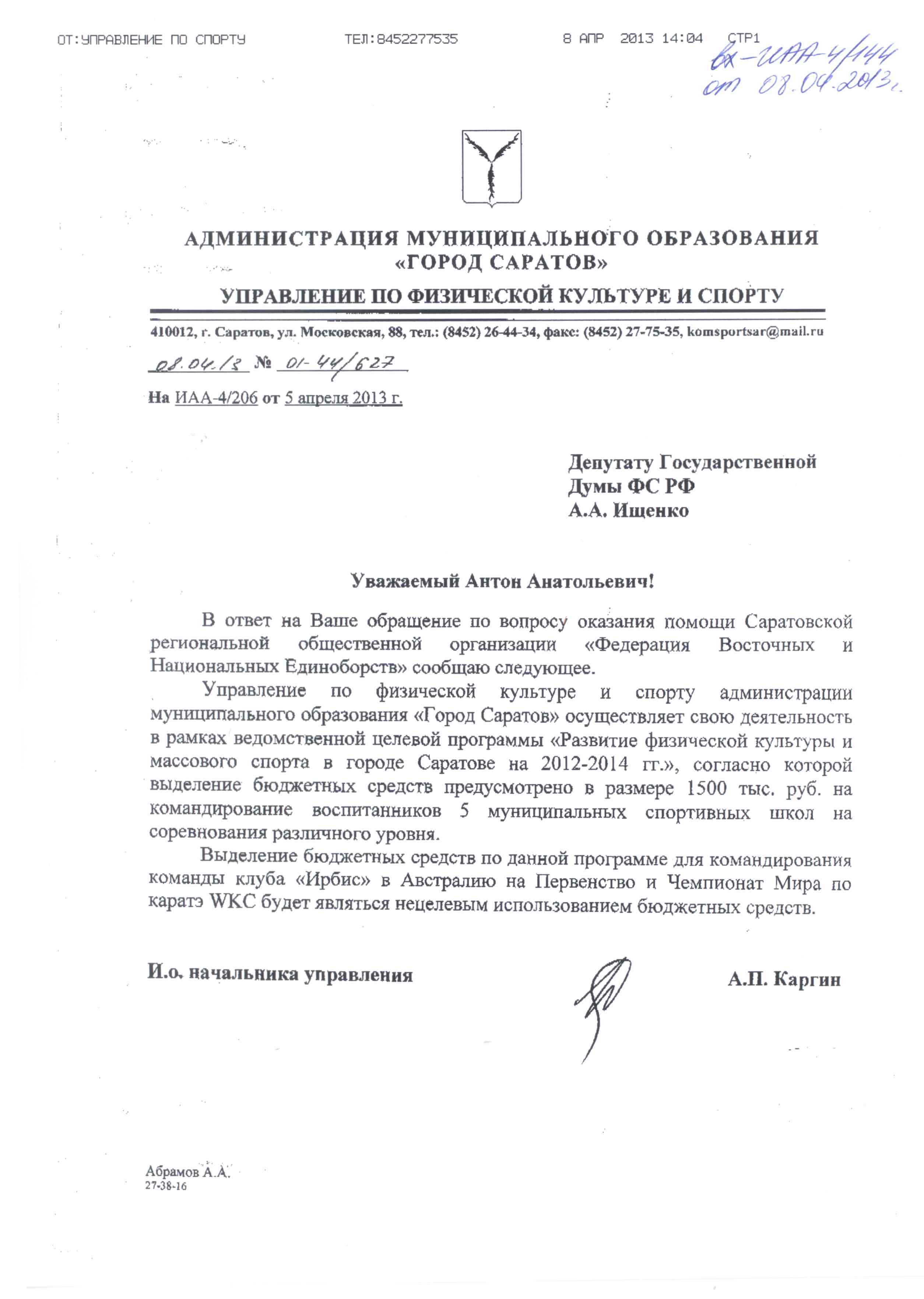 Напомним, 5 апреля Антон Ищенко обратился к Андрею Каргину (текст запроса здесь http://ldpr-saratov.ru/events/index.php?ELEMENT_ID=3813) с просьбой оказать содействие спортсменам «Федерации Восточных и Национальных Единоборств» (клуб «Ирбис») – изыскать средства на поездку на Первенство и Чемпионат Мира. Защищать честь России предстояло двум 10-летним каратистам, призерам различных соревнований. Изначально состав команды «Ирбиса» был значительно шире, но, учитывая затраты на поездку – Чемпионат будет проходить в Мельбурне (Австралия), - пришлось внести коррективы. Сумма в 500 тысяч рублей, необходимая российской делегации (двум спортсменам и двум тренерам) для того, чтобы страна все-таки была представлена в Мельбурне, оказалась для Управления по физической культуре и спорту Администрации Саратова неподъемной.