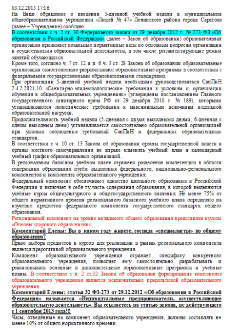 В заключении отмечу, что вышеизложенное не изменяет сути ответа, данного министерством образования Саратовской области относительно перехода обучающихся на пятидневную учебную неделю: выбор режима обучающихся и утверждение расписания относится к полномочиям образовательной организации и должен соответствовать требованиям СанПиН.