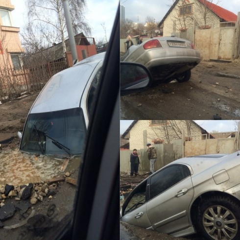 Инцидент произошел в районе Затона. При этом иномарка практически наполовину ушла в пробоину возле колодца, залитую либо талой водой, либо нечистотами. Судя по фото, водитель легковушки выбирался из салона через открытое окно. В настоящее время в районе происшествия наблюдается большая пробка.