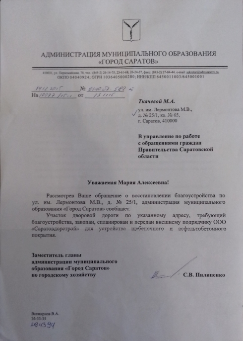 Уважаемый Сергей Владимирович! Уже больше 3-х месяцев прошло, как получен ответ за вашей подписью на наше обращение. Хочу уведомить Вас, что работы по данному вопросу не выполнены! Более того, ООО "Саратовдорстрой" более не работает с МУПП "Саратовводоканал". Прошу взять на контроль, и довести обращение до логического конца. С уважением, Ткачева Мария.
