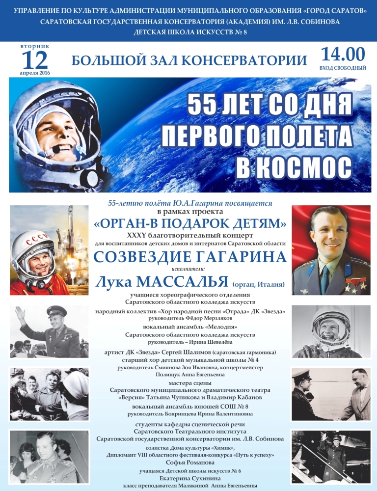 12 апреля 2016 г. в 14.00 в Большом зале Саратовской государственной консерватории им. Л.В. Собинова в рамках проекта благотворительных концертов «Орган – в подарок детям» для воспитанников детских домов, интернатов и коррекционных школ г. Саратова состоится совместное мероприятие «Созвездие Гагарина»управления по культуре администрации муниципального образования «Город Саратов» и ФГБУВО «Саратовская государственная консерватория имени Л.В. Собинова», посвящённое 55-летию полёта в космос Ю.А. Гагарина. В яркой тематической концертной программе «Созвездие Гагарина» выступят профессор Туринской консерватории Лука Массалья (орган), студенты ФГБУВО «Саратовская государственная консерватория имени Л.В. Собинова», студенты ГОУ СПО «Саратовский областной колледж искусств», артисты Саратовского муниципального нового драматического театра «Версия», МУК ДК «Звезда», МУК ДК «Химик», учащиеся детских школ искусств г. Саратова.На мероприятие приглашены воспитанники детских домов, интернатов и коррекционных школ г. Саратова, учащиеся средних общеобразовательных школ и детских школ искусств г. Саратова.