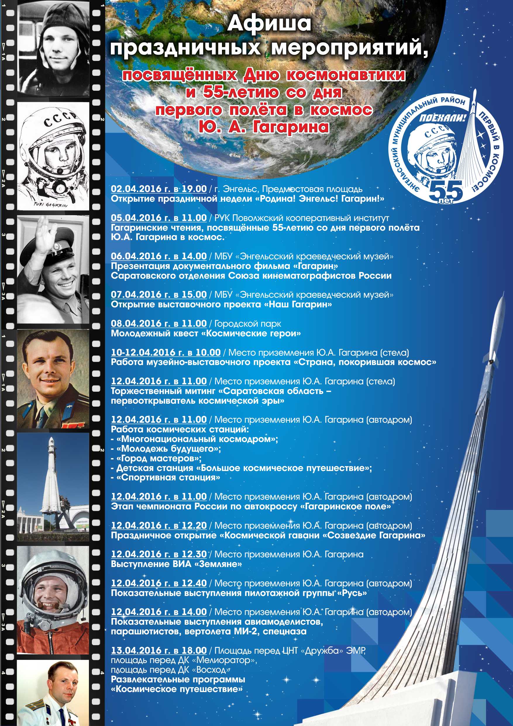 Юбилейные торжества, посвящённые 55-летию первого полёта человека в космос, пройдут в Энгельсском районе со 2 по 12 апреля 2016 года.