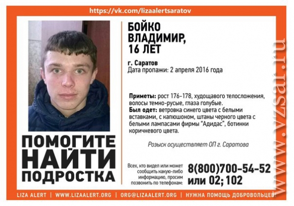 В Саратове без вести пропал 16-летний Владимир Бойко. Об этом сообщает официальная группа "ВКонтакте" поискового отряда "Лиза Алерт Саратов".