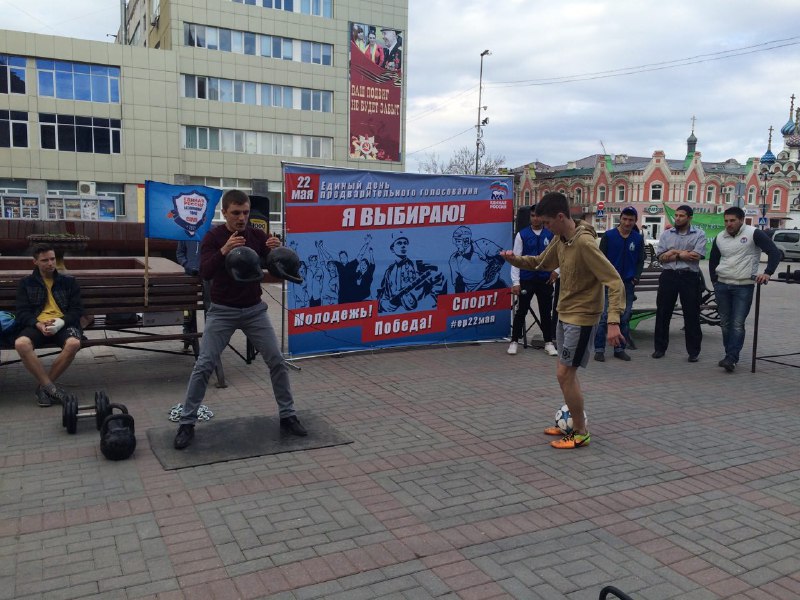 У здания Консерватории региональное отделение Партии «Единая Россия» организовало работу спортивной площадки, где каждый желающий смог попробовать свои силы в армрестлинге, гиревом спорте и футбольном фристайле.