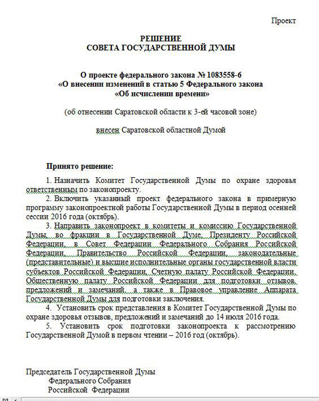 Напомним, что в документе предлагалось перевести 31 июля в третью часовую зону, Саратовская областная дума направила свою закинициативу в Москву 26 мая.