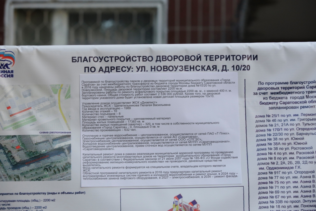 Двор дома 10/20 по ул. Новоузенской города Саратова будет отремонтирован по просьбе жителей в рамках проекта «Наш двор», инициированного Вячеславом Володиным. На встрече с жителями, на которой также присутствовали депутаты Государственной Думы Николай Панков и Ольга Баталина (фракция «Единая Россия»), он подробно рассказал о программе предстоящего масштабного ремонта. В Саратове в рамках проекта «Наш Двор» в этом году будут отремонтированы порядка 100 дворовых территорий. Благоустройство затронет не только дворы, но и парковые зоны, где будут установлены спортивные площадки, новые системы освещения и тротуары. Программа рассчитана на несколько лет. На реализацию проекта согласно соглашению, заключенному между Правительством Москвы и руководством Саратовской области будут выделены 300 млн руб.