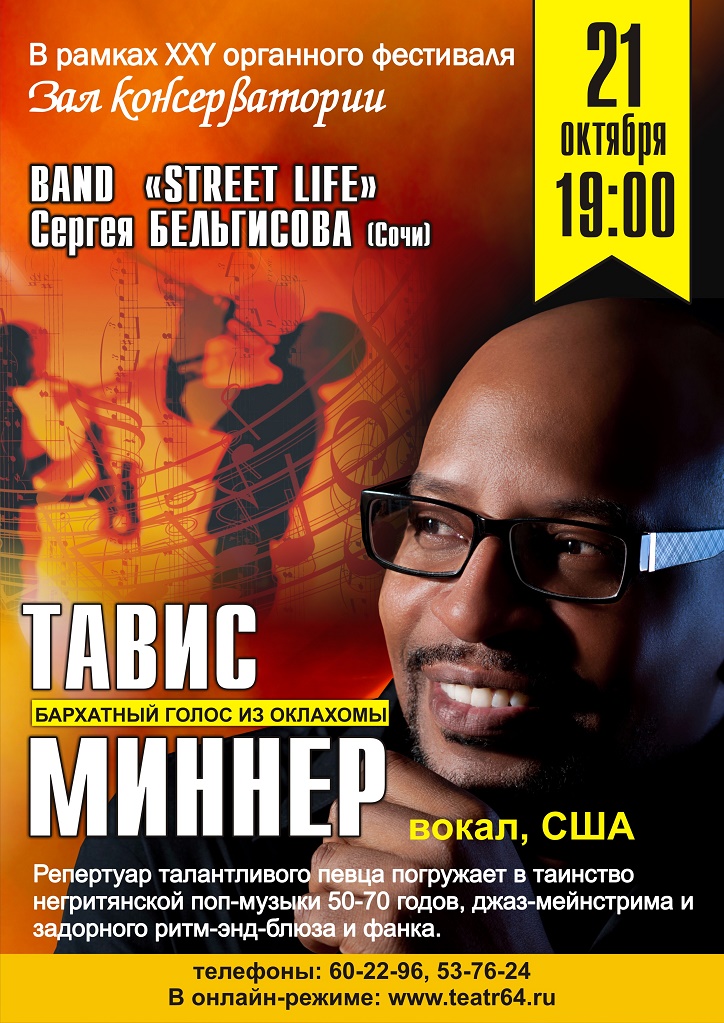 21 октября на XXY Международном органном фестивале пройдёт вечер негритянской джазовой музыкиТАВИСА МИННЕРА - «бархатного голоса из Оклахомы» - одного из самых харизматичных джазовых вокалистов США! Вслед за негритянской певицей Мэлой УОЛДРОН, порадовавшей саратовцев на прошлом органном фестивале, впервые в Саратове выступит Тавис Миннер. Его джазовая манера илегендарный бархатный голос роднят его с Луисом Армстронгом - родоначальником негритянского джазового пения.