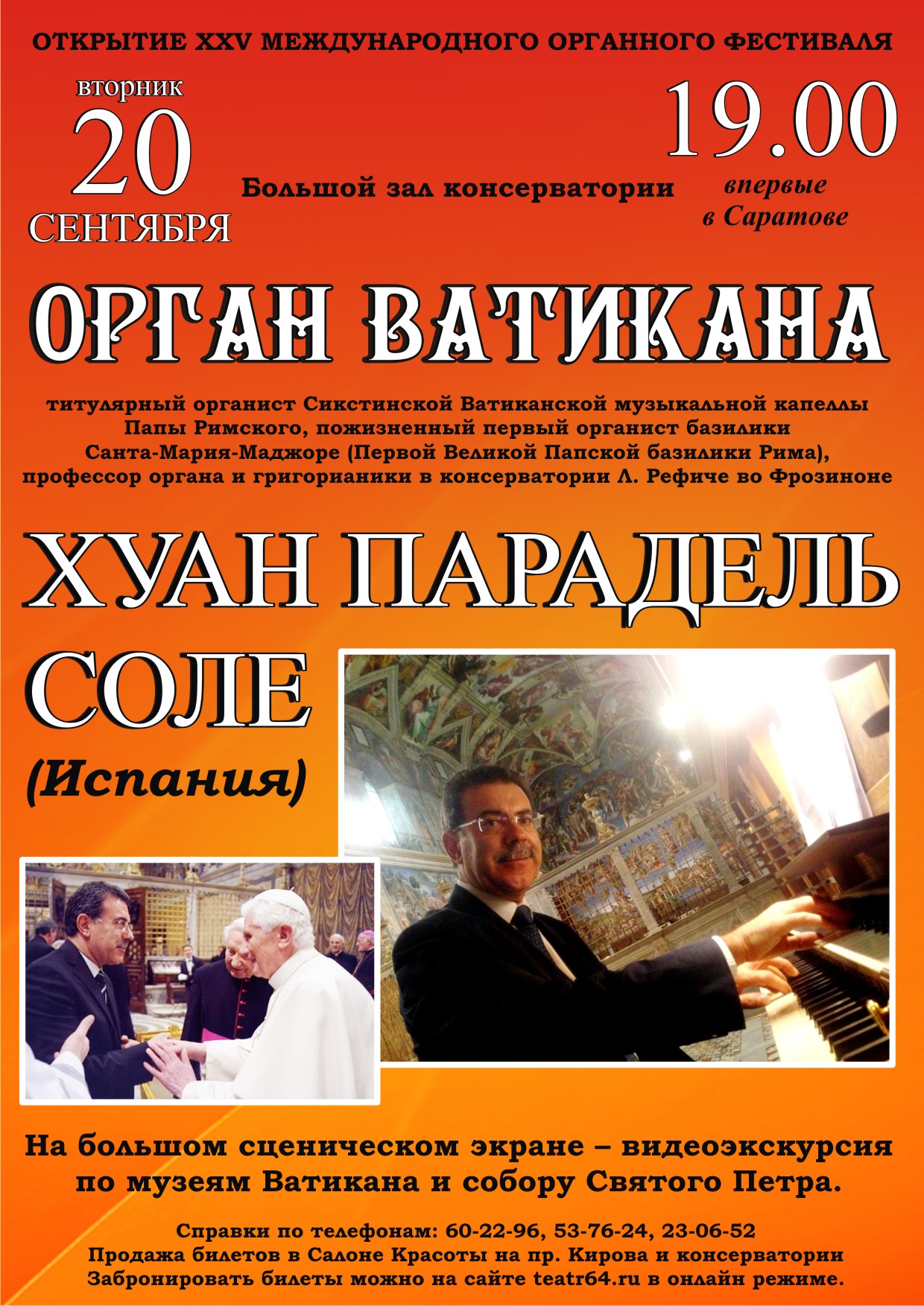 Объявлена программа концерта-открытия юбилейного XXV Международного саратовского органного фестиваля 20 сентября 2016 года титулярного органиста Сикстинской Папской музыкальной капеллы, пожизненного первого органиста Папской базилики Санта Мария Маджоре, профессора органа и григорианики в консерватории Л. Рефиче во Фрозиноне ХУАНА ПАРАДЕЛЬ СОЛЕ (Испания).