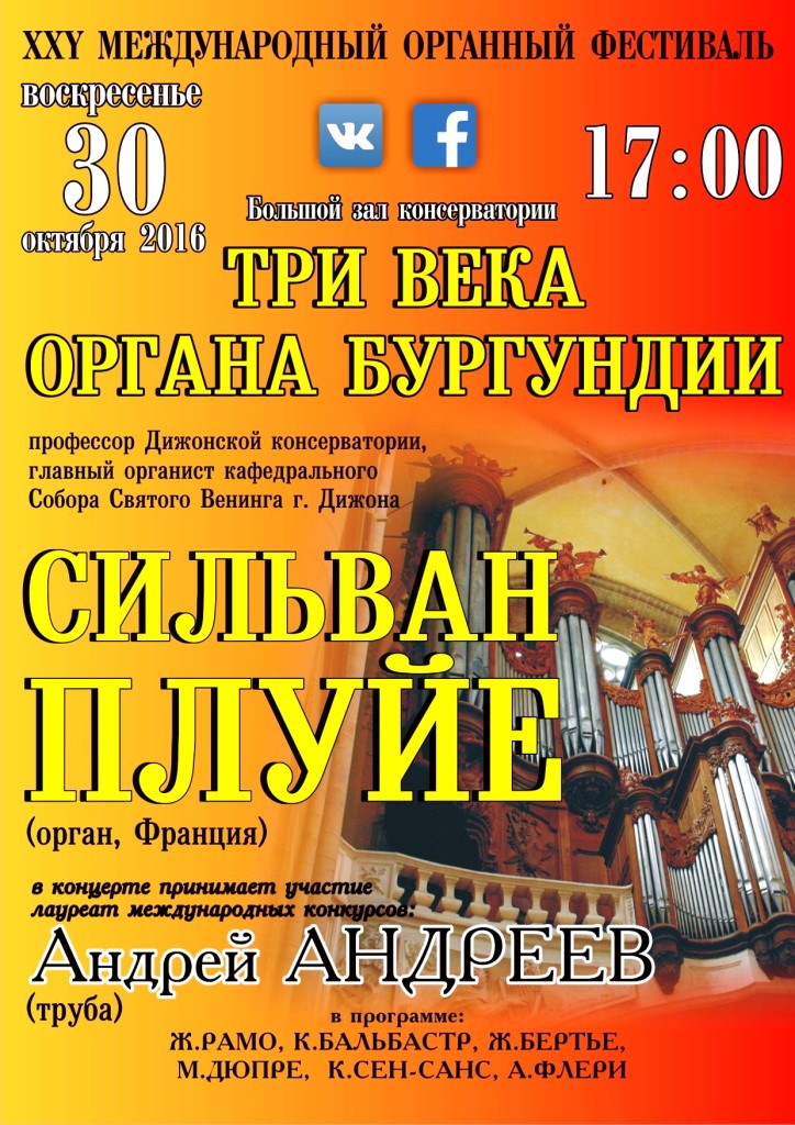 30 октября с программой «ТРИ ВЕКА ОРГАНА БУРГУНДИИ» выступит профессор Дижонской консерватории, главный органист кафедрального собора Святого Венинга Сильван ПЛУЙЕ (Франция) и Андрей АНДРЕЕВ (труба) с программой. Опыт многолетних выступлений Сильвана в Европе не прошёл бесследно – его игра отличается огромным разнообразием регистровки и пластичностью.