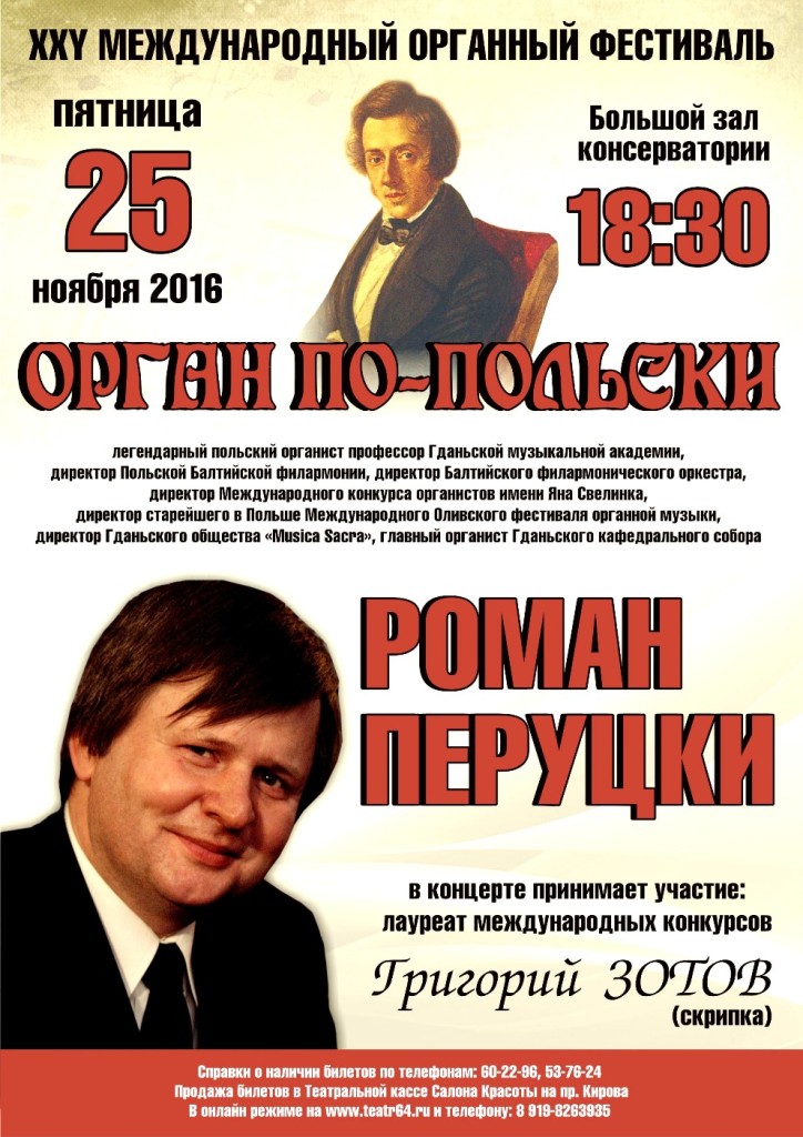 25 ноября. Новая премьера Фестиваля. Программу «Орган по-польски» представит легендарный польский органист, главный органист старейшего собора в Оливе (Гданьск), профессор Музыкальной Академии Гданьска Роман ПЕРУЦКИ (Польша) с Григорием ЗОТОВЫМ (скрипка)из лучшей немецкой и польской органной музыки 18-20х веков.