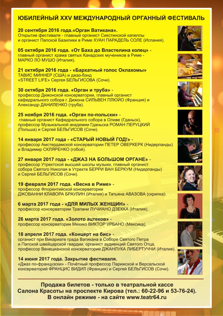 27 января 2017 с яркой программой «БОЛЬШОЙ ДЖАЗ НА ОРГАНЕ» также впервые выступит профессор Утрехтской высшей школы музыки, главный органист собора Святого Николая в Утрехте Берри ван БЕРКУМ (Нидерланды) и Сергей БЕЛЬГИСОВ (саксофон, Сочи).