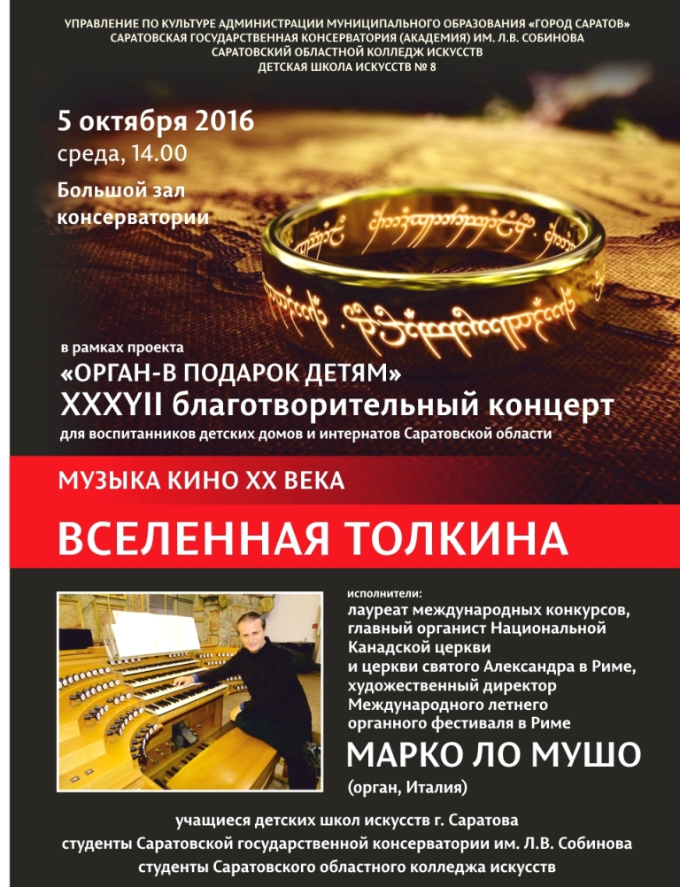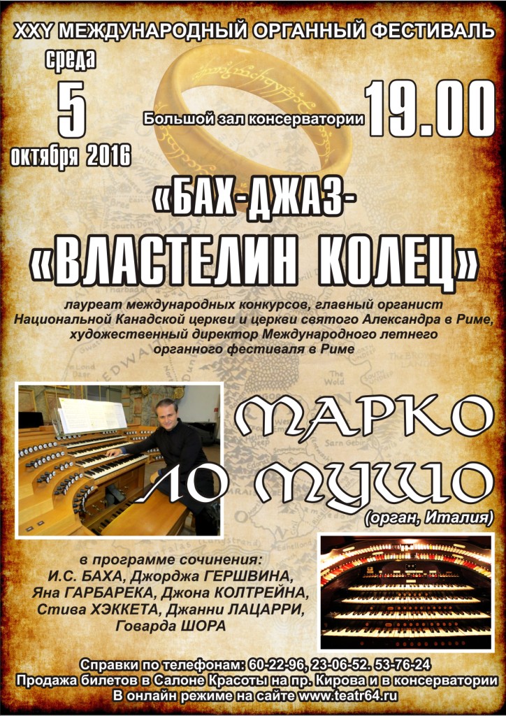 5 октября на Фестивале состоится сказочный вечер, прозвучит программа «От Баха до Властелина колец» с музыкой Баха, Гершвина, Колтрейна, Хэккета, Лаццарри, Шора - близкой образам величайшей книги 20 века «Властелин колец» Джона Толкина. Под сводами Большого зала соединятся классика и джаз. Исполнитель - легенда современного органного искусства, главный органист Национальной Канадской церкви и церкви св. Александра в Риме, художественный директор Римского Международного органного фестиваля МАРКО ЛО МУШО. На сценическом видеоэкране – отрывки кинотрилогии «Властелин колец».