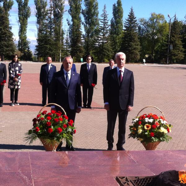 Столичный гость вместе с губернатором Валерием Радаевым возложил цветы к памятнику землякам, погибшим в годы Великой Отечественной войны, а также к мемориалам «Журавли» и «Колокол».