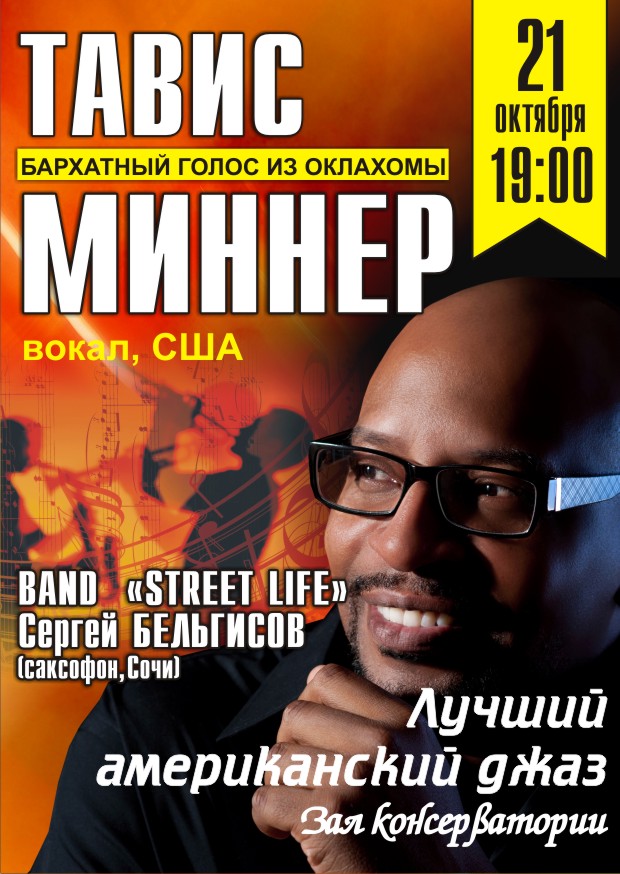 21 октября на XXY Международном органном фестивале пройдёт вечер негритянской джазовой музыки ТАВИСА МИННЕРА - «бархатного голоса из Оклахомы» - одного из самых харизматичных джазовых вокалистов США! Вслед за негритянской певицей Мэлой УОЛДРОН, порадовавшей саратовцев на прошлом органном фестивале, впервые в Саратове выступит Тавис Миннер. Его джазовая манера и легендарный бархатный голос роднят его с Луисом Армстронгом - родоначальником негритянского джазового пения.Тавис –провосходный шоу-мен, обладает восхитительной вокальной импровизацией с имитацией инструментальных приемов исполнения джаз-банда. С отличием окончил Северо-Восточный государственный университет в области вокальной музыки. В ансамбле с Тависом выступят блестящий саксофонист Сергей БЕЛЬГИСОВ (Сочи) и джазовый БЭНД «STREET LIFE”.