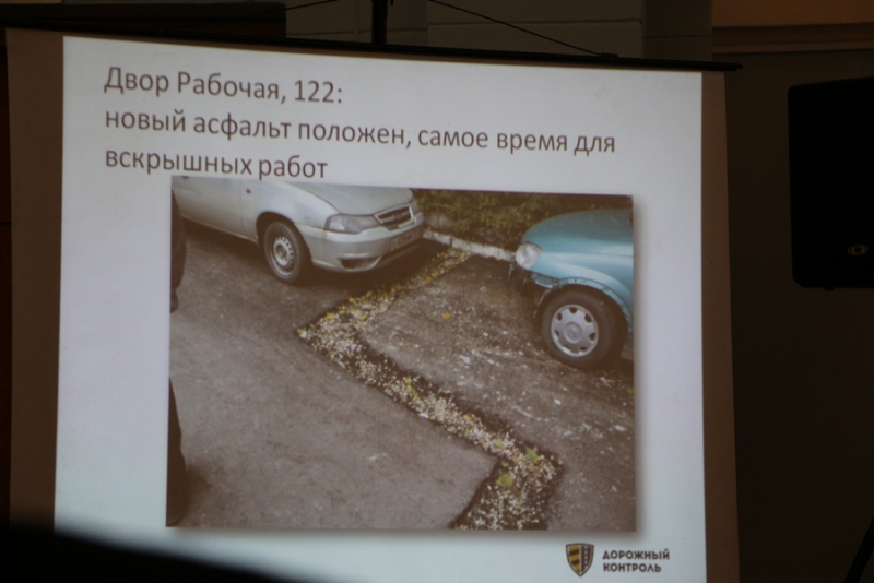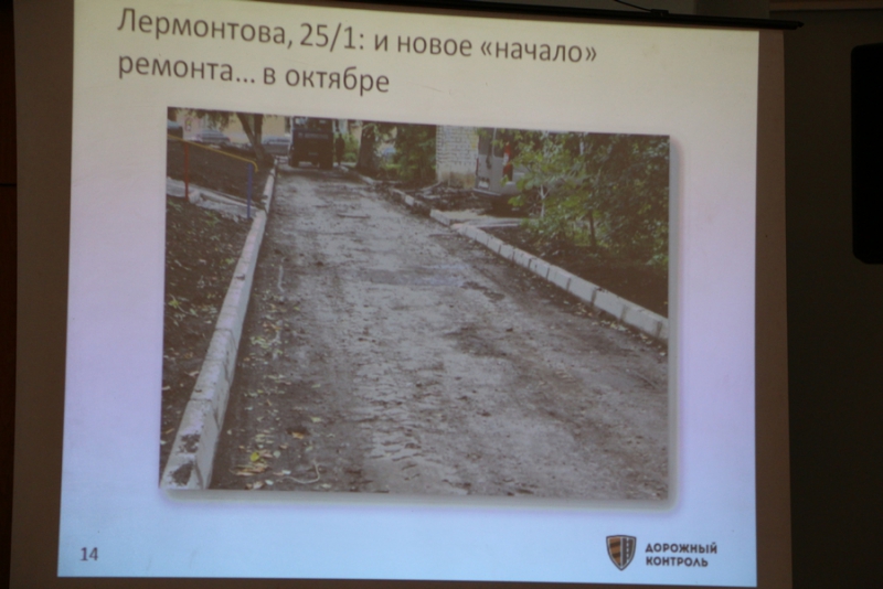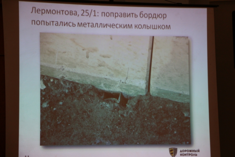 В качестве наглядного примера работы дорожно-строительных организаций он привел «самый вопиющий случай» - двор на Лермонтова, 25/1, который благоустраивается в рамках проекта «Наш двор», поскольку «здесь наглядно видно, как подрядчики и заказчики относятся к ремонту». Николай Гурин подробно рассказал о главных недочетах при выполнении работ: неудовлетворительно выполненные скрытые работы, плохо уложенный бордюр, неровность асфальбетонного покрытия . На одном из слайдов было видно, что угол стыка бордюра, где не хватило камня, заложили всем, что, вероятно, попалось под руку.