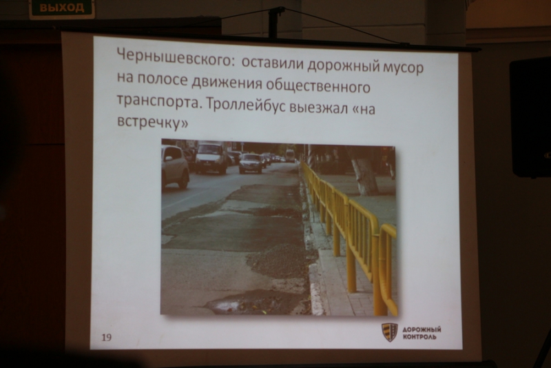 Другими примерами беспечности дорожных организаций и контролирующих их чиновников стали оставленные открытыми после демонтажа старого асфальта люки, в один из них на Чернышевского угодило 5 машин, а для банального исправления ситуации потребовалось обращение «Дорожного контроля» в дорожный комитет. Другим примером стал покрывшийся трещинами и многочисленными лужами тротуар на Слонова, который должны были переделать картами, но выполнили работы "для галочки", в основном оставив неисправленными выявленные нарушения. Двор дома №122 на Рабочей набрал целый букет нарушений, вплоть до организации вскрышных работ после укладки асфальтобетона. Были отмечены непролазные дворы после снятия слоя асфальта в Заводском и Ленинском районах, где жители по колено в грязи были вынуждены идти к своим домам. Докладчик не прошел мимо некачественного ремонта дороги на 2-м Детском проезде и уложеннного на тротуарную плитку асфальта на Челюскинцев.