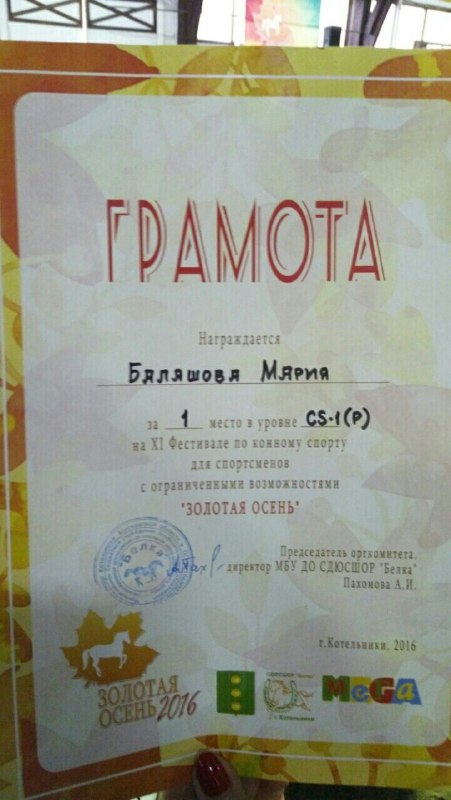 Юная Мария Балашова стала победительницей в специальной категории и привезла домой Кубок и медаль за 1-е место. Мама Маши, Надежда Проданова, поделилась впечатлениями от победы: «Мы участвуем в соревнованиях второй раз, но такую награду получаем впервые. Вообще, терапия через общение с животными - это замечательная инициатива. Конечно, Маша была очень рада этой победе. Она занимается не только конным спортом, - у нее получается рисовать, петь, заниматься лепкой, у нас также есть Хрустальная корона – награда за победу в модельном конкурсе. Дома у нас много места с дипломами, медалями и другими наградами. Для меня каждая награда – это гордость за Машу». Отвечая на вопрос журналистов, Надежда допустила, что в будущем Маша сможет принять участие и в Паралимпиаде, ведь конный спорт является одним из видов паралимпийской программы.