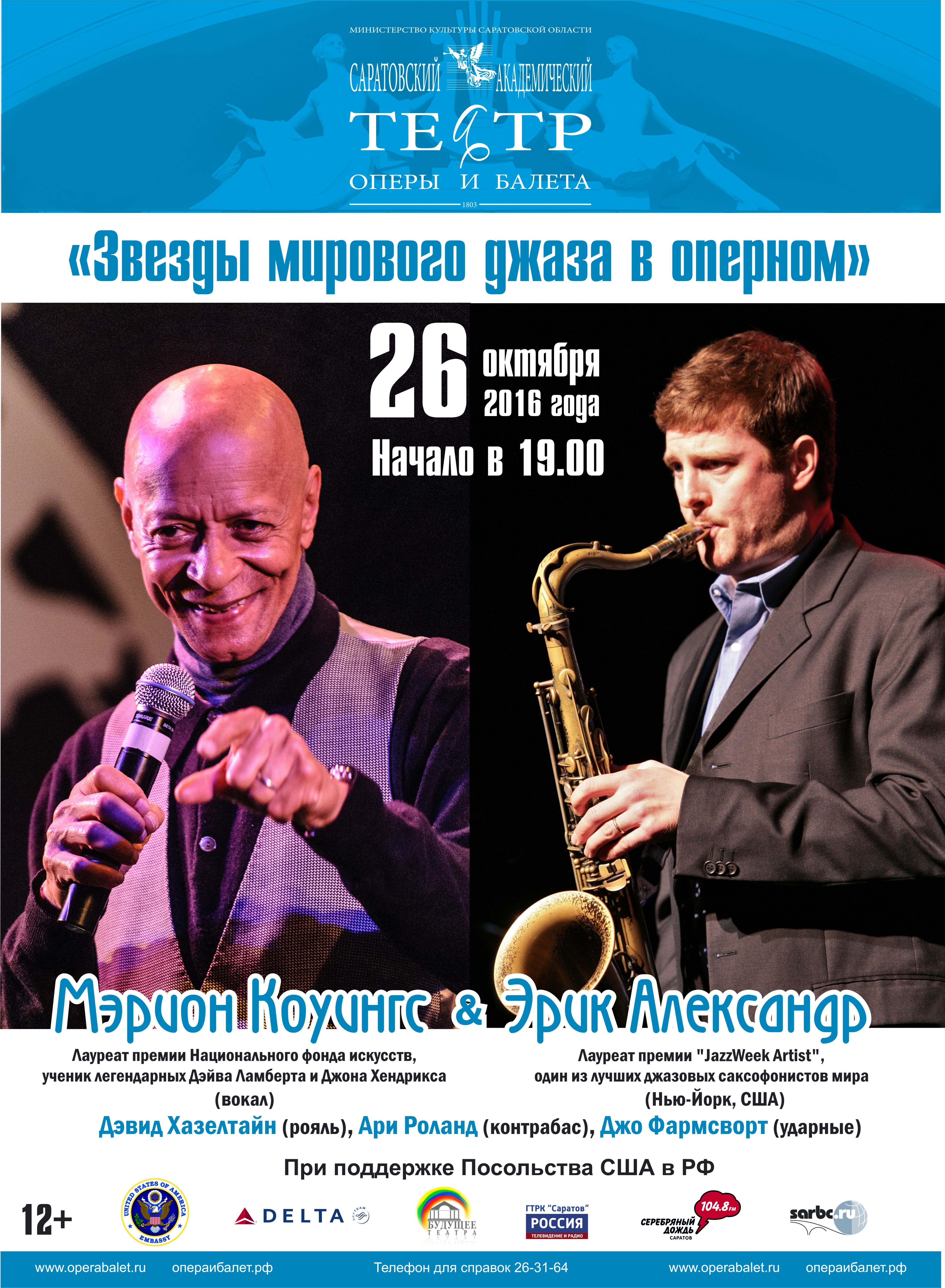 26 октября в рамках проекта «Звезды мирового джаза в оперном» на сцене Саратовского академического театра оперы и балета выступят прославленные джазовые музыканты из Нью-Йорка Мэрион Коуингс (вокал) и квартет Эрика Александра.