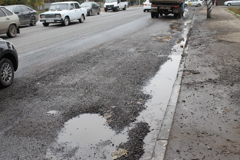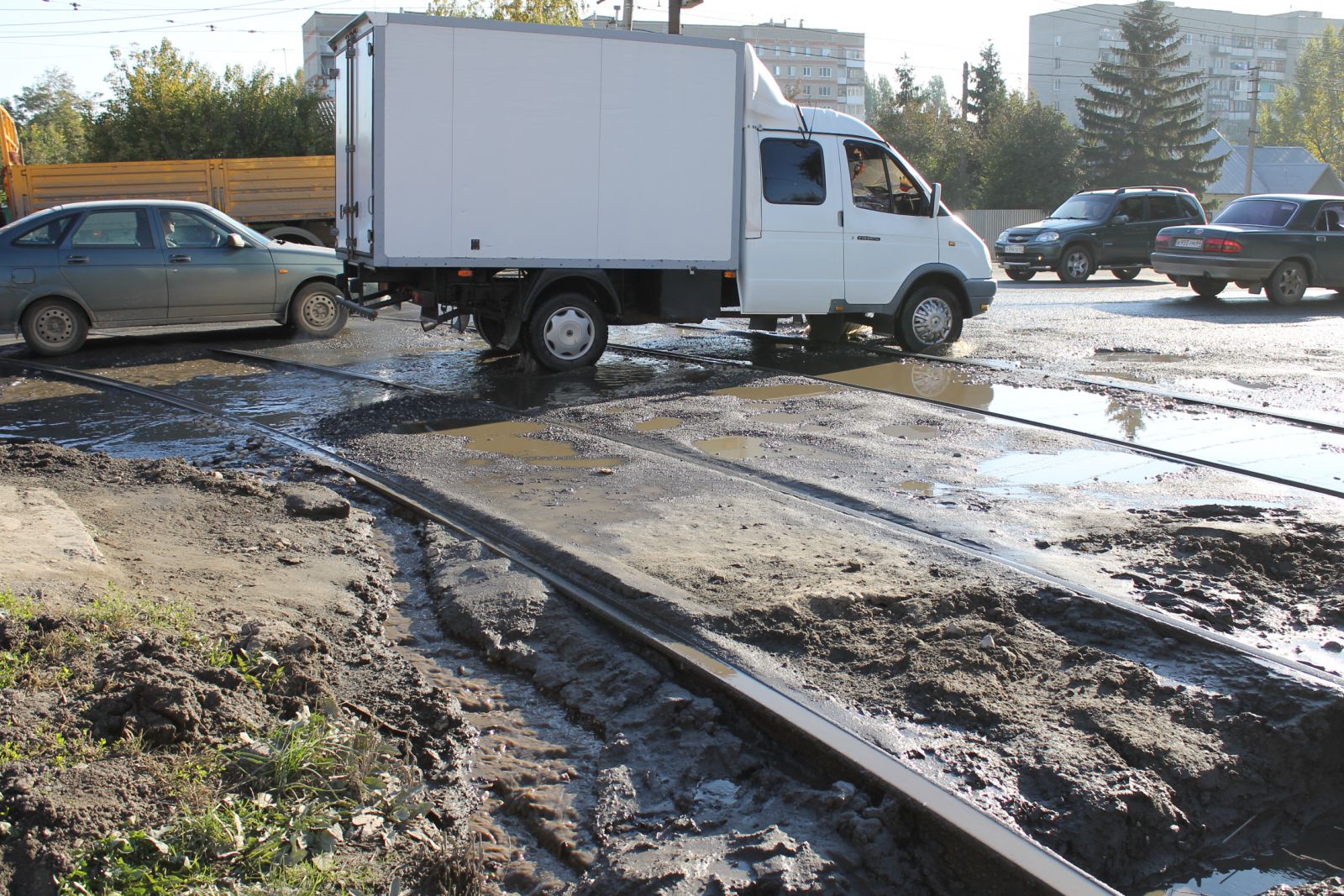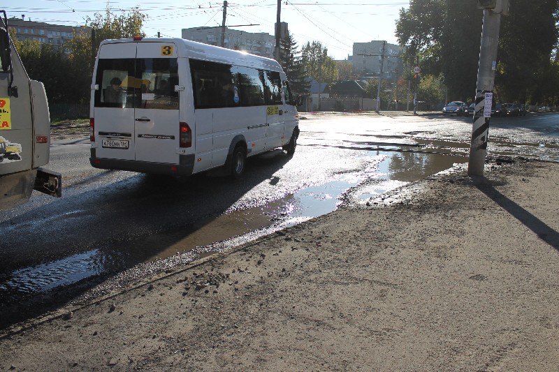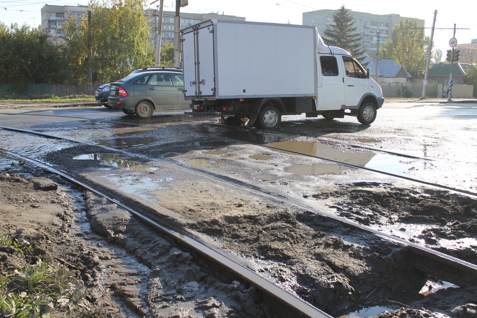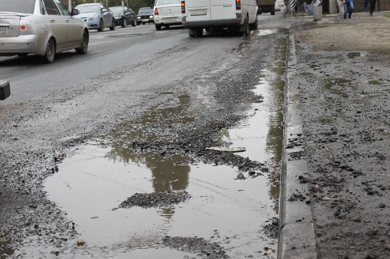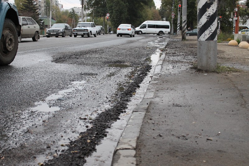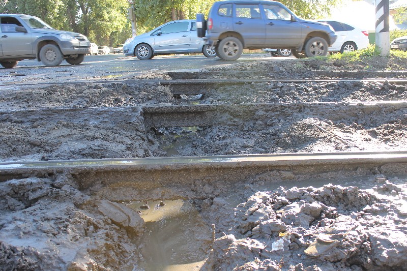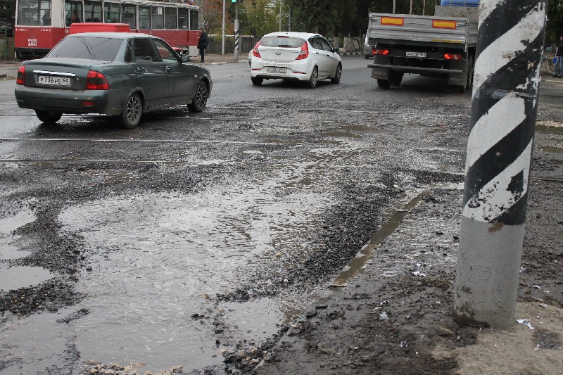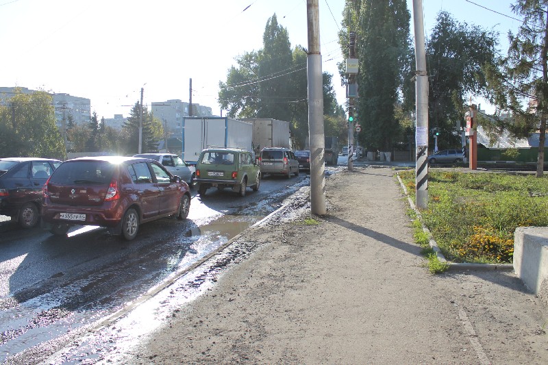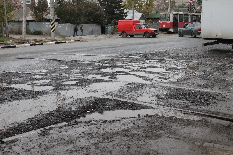 «Дорожный контроль» уже делал репортаж по данному участку в июне этого года, и с того момента изменения произошли только в худшую сторону. Ямы, скрываемые под толщью воды, стали ещё глубже, поэтому движение в правой полосе по направлению к Заводскому району на легковом автомобиле стало крайне опасным, а местами вовсе невозможным. В час пик проезд по этому участку дороги превращается в одну сплошную пытку, движение транспорта замирает, создавая длинную пробку. Ситуацию усугубляют пересекающие дорогу трамвайные рельсы.