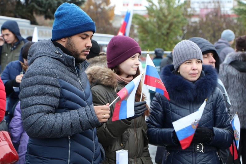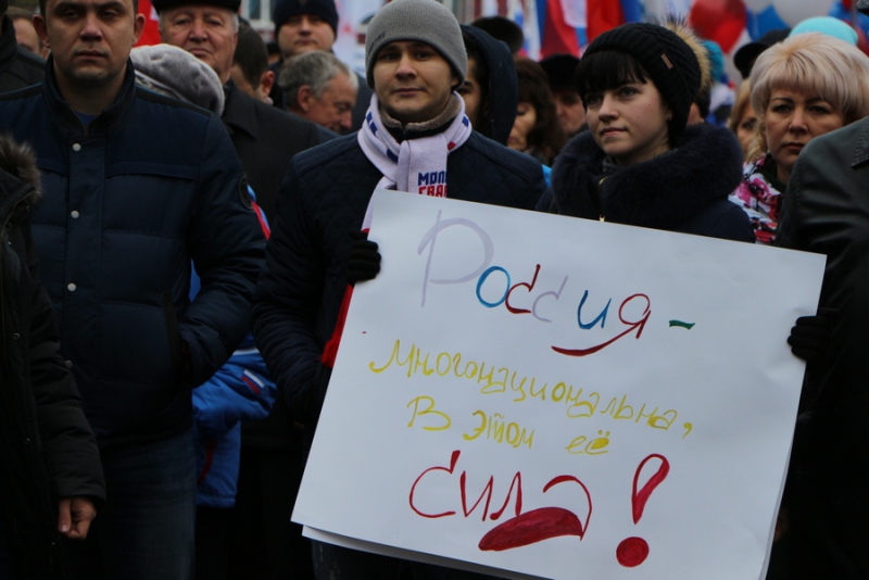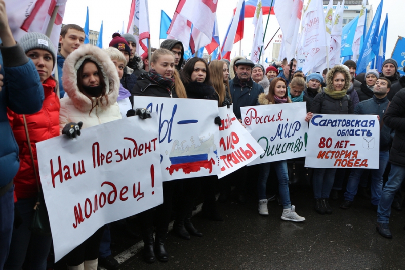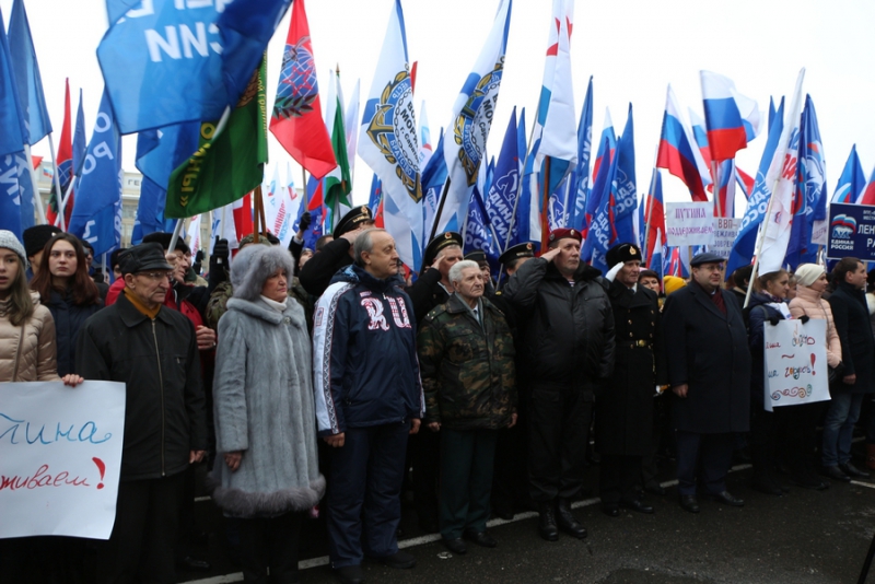 По оценкам организаторов, в митинге приняли участие порядка 11 тысяч граждан. Почти у каждого из них в руках были флаги Российской Федерации или плакаты с различными лозунгами. К примеру, чаще всего можно было увидеть растяжки с надписями «Наш президент – молодец», «Наша область – наша гордость» или «Россия – это мы».