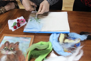 Шерстяная акварель – интересная и многогранная техника, которая применяется и для изготовления картин из шерсти и для создания ярких, неповторимых шерстяных изделий. Проживающие дома-интерната с восхищением наблюдали за процессом создания картины. Многие отметили, что данный вид искусства не требует больших временных и материальных затрат. Прилагая в процессе работы фантазию, терпение, упорство, творческое вдохновение, каждое изделие становится уникальным.