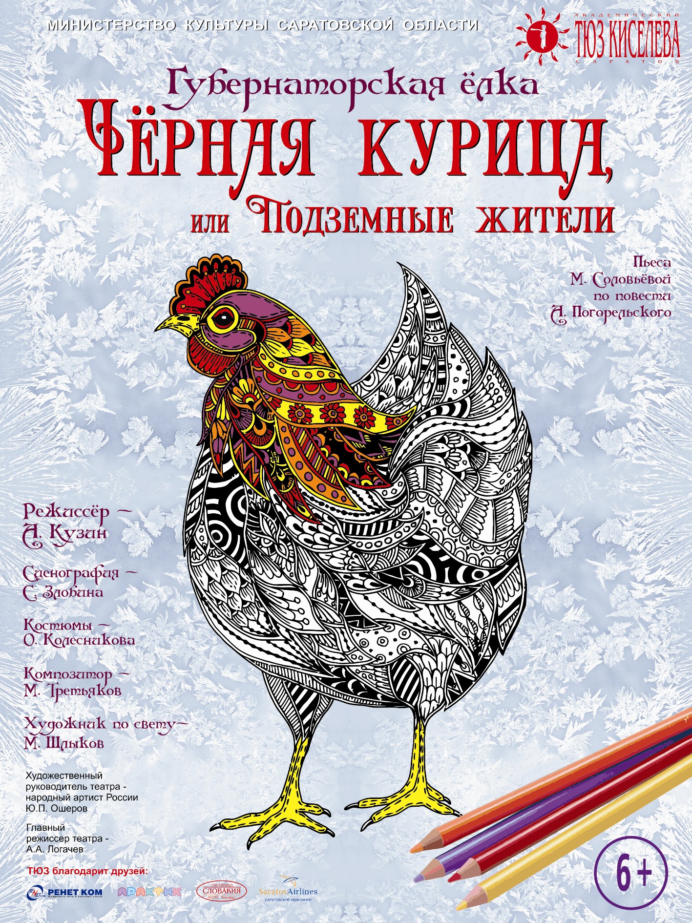 Как и прошлые работы этого творческого объединения авторов, спектакль «Черная курица, или Подземные жители» подарит зрителям незабываемо яркий и красочный мир волшебной сказки, динамичную, полную чудесных событий поучительную историю для зрителей старше 6 лет. Приглашаем детей и их родителей в сказочное путешествие в мир театра на новогодних праздниках!