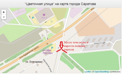 Вторую неделю на пересечении улиц Цветочная и Лучезарная напротив магазина "Лента" течёт вода. В образовавшихся водно-ледяных торосах вязнут машины.