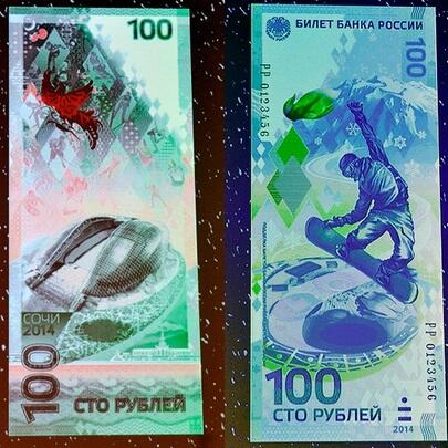 30 октября 2013 года, за 100 дней до начала Олимпийских игр в Сочи, Банк России выпустил в обращение олимпийскую банкноту номиналом 100 рублей. Главная изюминка данных банкнот – впервые в истории изображение вертикально ориентировано.