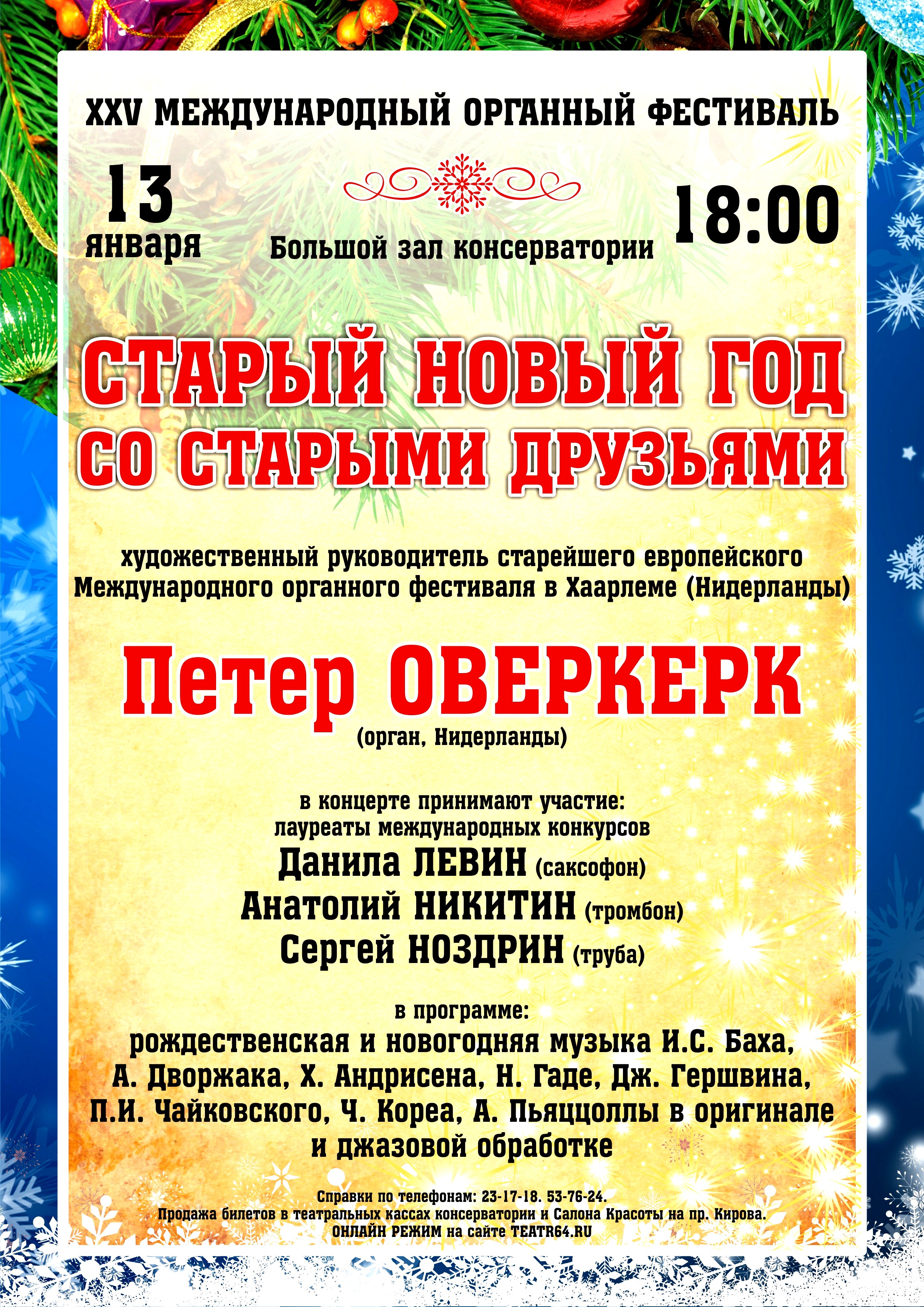 13 января в 18.00 в рамках 25-го Международного органного фестиваля состоится Вечер «СТАРЫЙ НОВЫЙ ГОД СО СТАРЫМИ ДРУЗЬЯМИ». Исполнителями выступят художественный руководитель старейшего европейского Международного органного фестиваля в городе Хаарлеме (Нидерланды), профессор Амстердамской консерватории Петер Оверкерк и джазовое трио в составе лауреатов международных конкурсов Данилы Левина (саксофон), Анатолия Никитина (тромбон), Сергея Ноздрина (кларнет) с рождественской и новогодней музыкой И.С. Баха, А. Дворжака, Х. Андрисена, Н. Гаде, Дж. Гершвина, П.И. Чайковского, Ч. Кореа, А. Пьяццоллы в оригинале и джазовой обработке.
