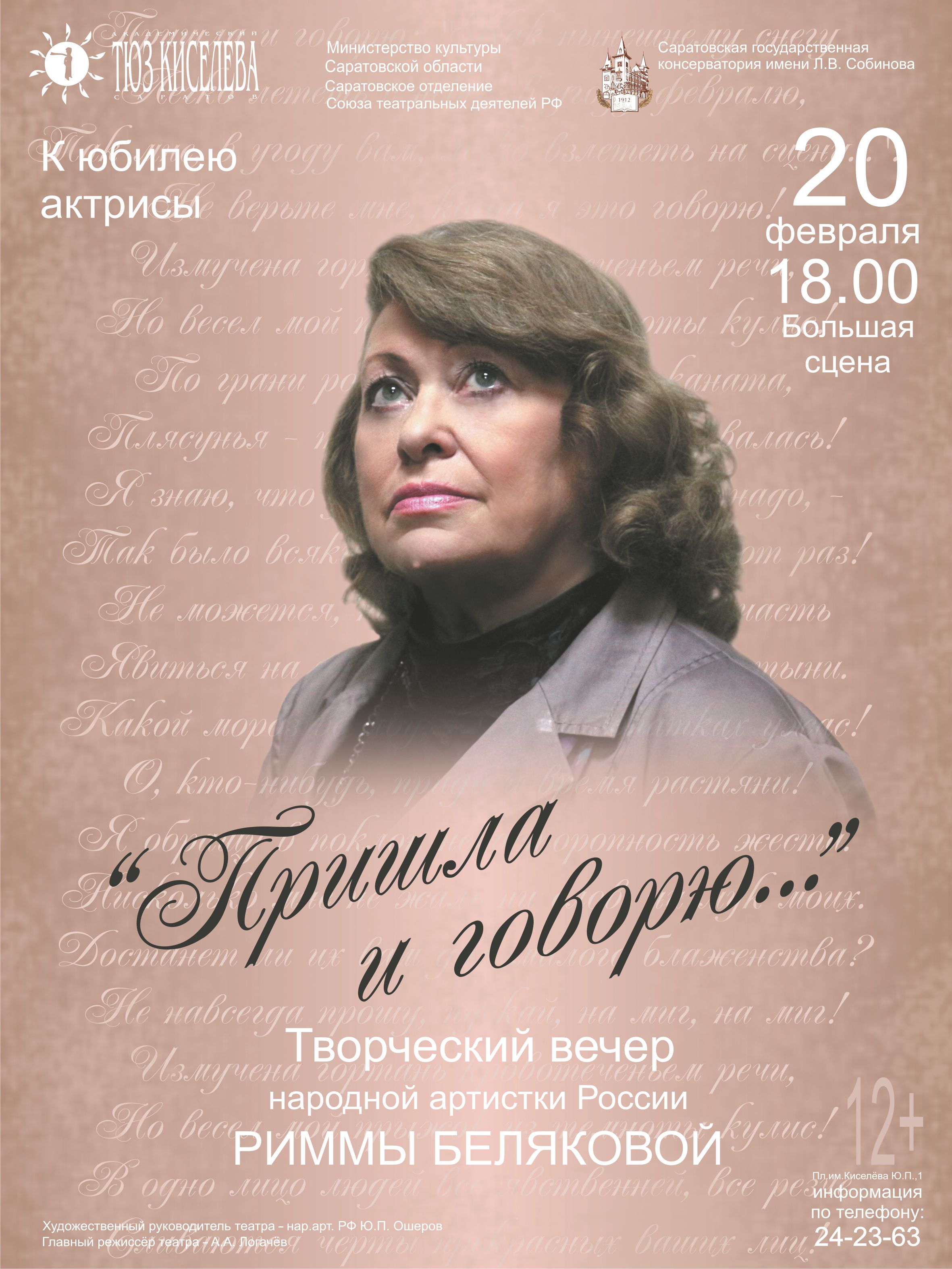 Творческий вечер народной артистки России Риммы Ивановны Беляковой «Пришла и говорю…», приуроченный к юбилею актрисы, пройдет 20 февраля 2017 года в 18-00 на Большой сцене Саратовского театра юного зрителя им. Ю.П. Киселёва. Режиссер и ведущий вечера – Олег Загумённов.