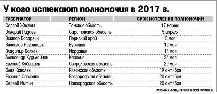 «К началу февраля возникли предпосылки для пакетных решений по определению участи 10 глав регионов, полномочия которых заканчиваются в 2017 году», – делают вывод эксперты «Петербургской политики».