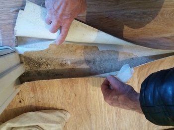 Линолеум без основы уложен непосредственно на бетон без пароизоляции, гидроизоляции, без утеплителя. От проникающей влаги линолеум под мебелью отсырел и почернел, мебель влажная, отчего портится. Потолки (плитка) отваливается во всех квартирах, где мы побывали. Обои, которые отваливались в 2016 году, в 2017 году отвалились совсем.