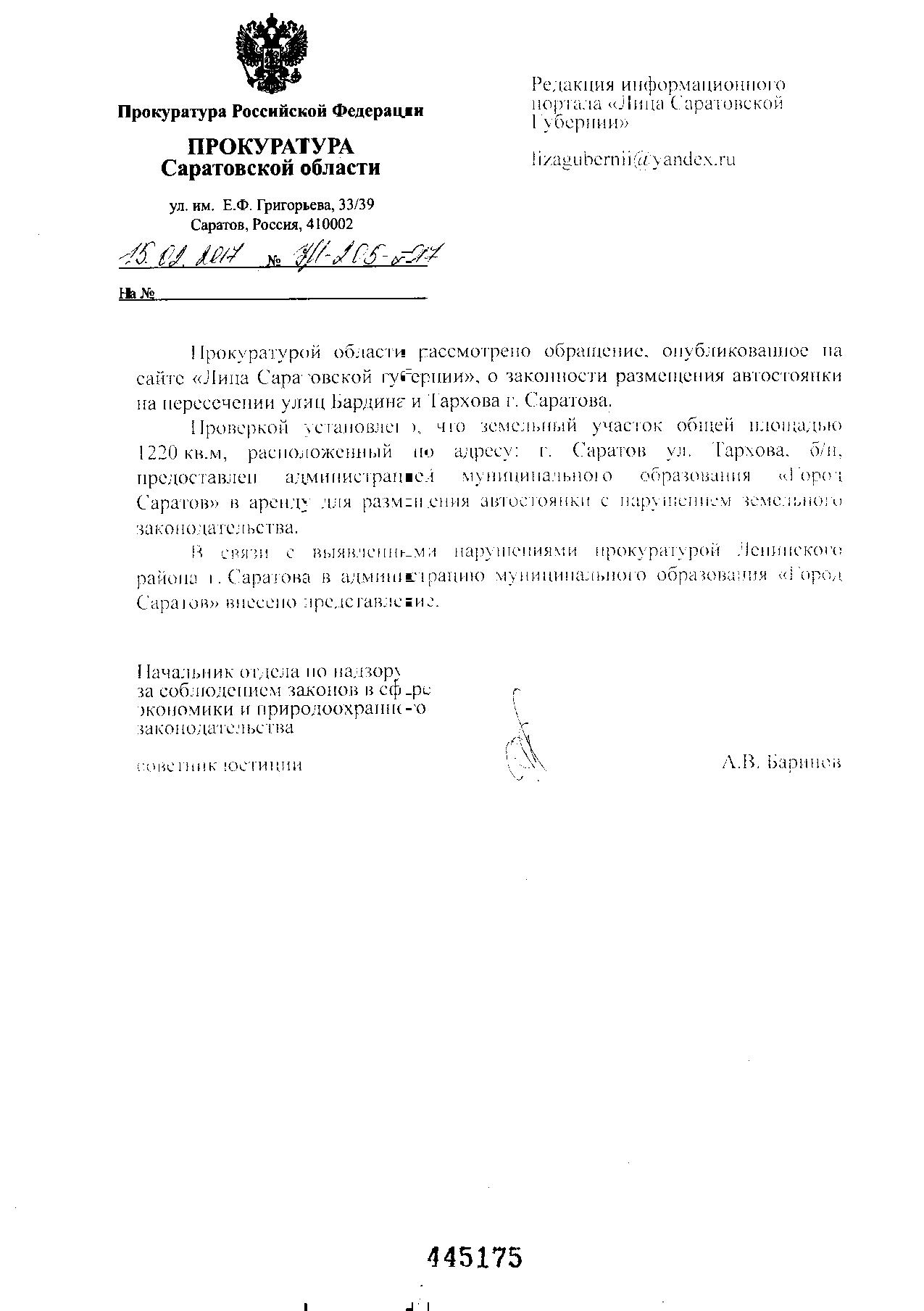 Уважаемый Сергей Владимирович. Прошу провести проверку на законность ограждения автостоянки на пересечении улиц Бардина и Тархова.