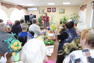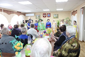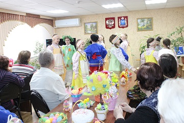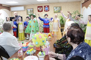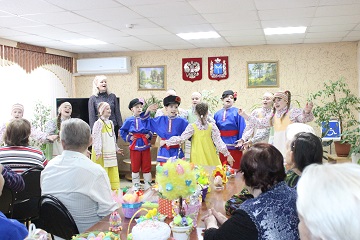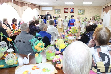 По давно сложившейся традиции, ребята и преподаватели привезли в подарок проживающим дома-интерната пасхальные сувениры ручной работы. Красочные поделки, выполненные в самых разных техниках, заняли свои места в читальном зале учреждения, где каждый желающий мог насладиться талантом юных мастеров. Но только выставкой гости не ограничились. Они показали также тематический мини-концерт, на котором рассказывали о пасхальных традициях, читали стихи. Выступление фольклорного ансамбля произвело настоящий фурор, зрители тихо подпевали исполнителям, стараясь не заглушить чистые детские голоса.