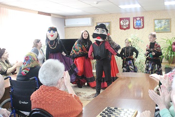 7 апреля в учреждении выступили воспитанники и педагоги ГБУ СО «Социально-реабилитационный центр для несовершеннолетних «Надежда». Ребята из «Надежды» частые гости в доме-интернате, местные бабушки и дедушки всегда ждут их с нетерпением и встречают как родных. Дружескую встречу поколений провели в уютном помещении читального зала. Выступления были по-весеннему светлыми, тёплыми и яркими, а голоса вокалистов нежными и чистыми, как ландыши из знаменитой песни. Танец старушек-веселушек в исполнении малышей младшей группы покорил сердца всех без исключения и сорвал просто шквал оваций. Настоящим гвоздем программы стал театрализованный танцевальный номер «цыганской труппы».