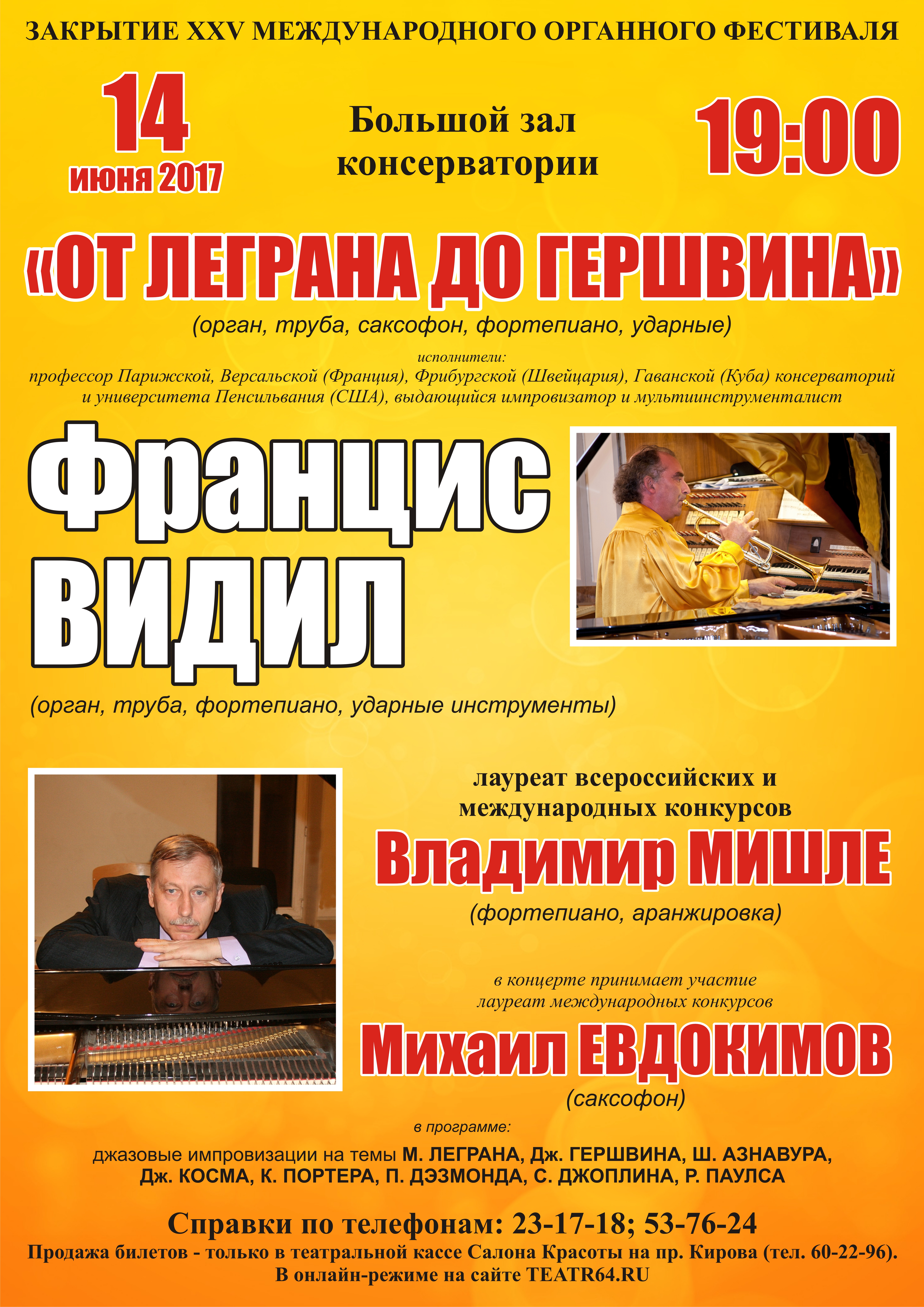 14 июня 2017 года состоится концерт-закрытие XXV Международного саратовского органного фестиваля с участием Почётного профессора Парижской и Версальской консерваторий, приглашённого профессора консерваторий Фрибурга (Швейцария) и Гаваны (Куба), музыкального факультета университета штата Пенсильвании (США), выдающегося импровизатора-мультиинструменталиста Франциса ВИДИЛА (орган, труба, рояль), пианистом-импровизатором в стиле Раймонда ПАУЛСА – Владимиром МИШЛЕ, джазовым саксофонистом Михаилом ЕВДОКИМОВЫМ.