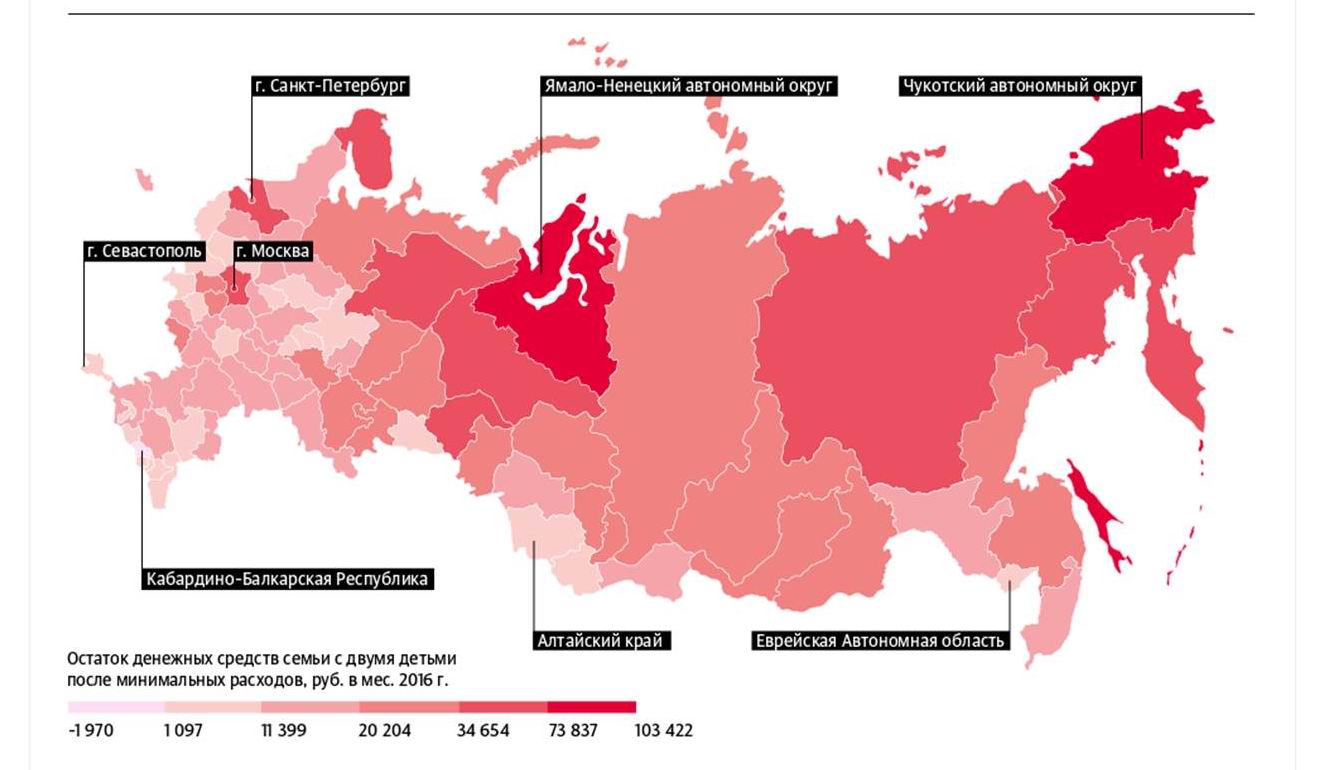 Эксперты «РИА Рейтинг» провели анализ данных Росстата, где говорилось о доходах россиян, и выяснили, сколько остается денег у жителей регионов после минимальных жизненно необходимых трат. Расчет для семей с двумя детьми производился путем сложения средней в субъекте номинальной заработной платы двух взрослых человек по итогам года и вычитанием из получившейся суммы двух региональных прожиточных минимумов для трудоспособного населения.
