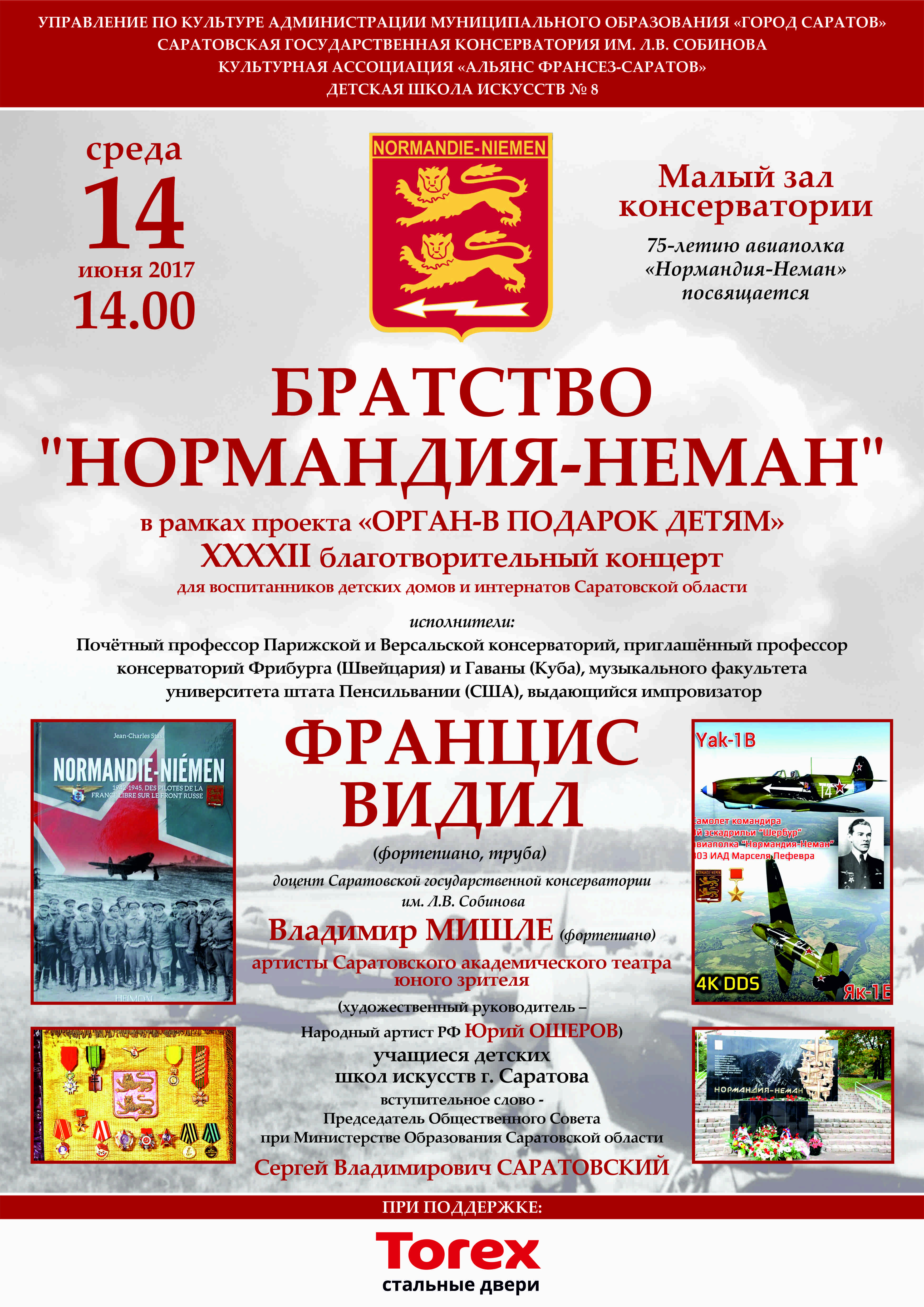 14 июня 2017 года в 14.00 в Малом зале Саратовской консерватории для воспитанников детских домов и интернатов Саратовской области состоится XXXXII благотворительный концерт проекта ДШИ № 8 «Орган – в подарок детям» «Братство «Нормандия-Неман». В ансамбле с Почётным профессором Парижской и Версальской консерваторий Францисом Видилом выступят саратовский композитор и джазовый импровизатор Владимир Мишле, студенты Саратовской консерватории, Театрального института, Саратовского областного колледжа искусств и учащиеся Детских школ искусств. Прозучит французская музыка и песни 40х годов 20 века. Культурной ассоциацией «Альянс Франсез-Саратов» будут вручены Дипломы победителям конкурса детского рисунка, посвящённого 75-летию со дня основания легендарного авиаполка. Ведущим выступит руководитель проекта – кандидат искусствоведения Олег Белоцерковский.