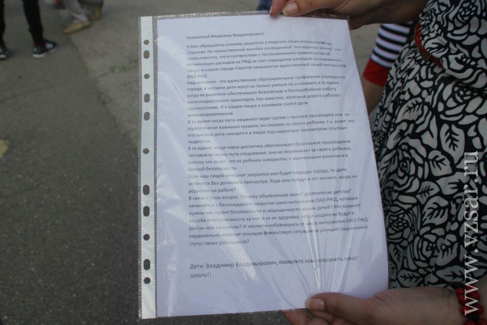 Сегодня, 9 июня, в Саратове родители, педагоги и ученики школы-интерната № 6 ОАО "РЖД" (компанию возглавляет Олег Белозеров) выступили с открытым обращением к президенту России Владимиру Путину.