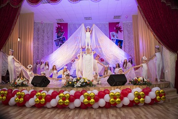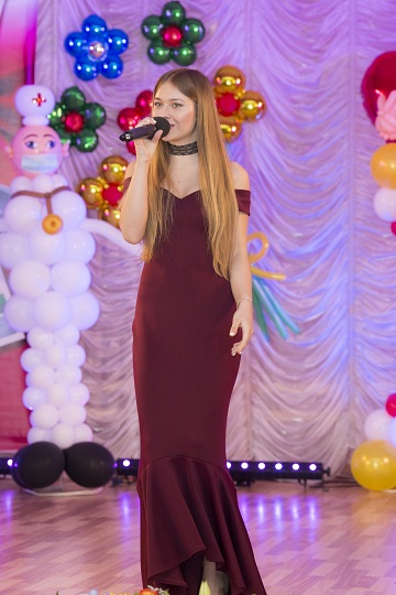 Мероприятие продолжилось в актовом зале дома-интерната, украшенном оригинальными композициями из воздушных шаров и прекрасными икебанами из живых цветов.