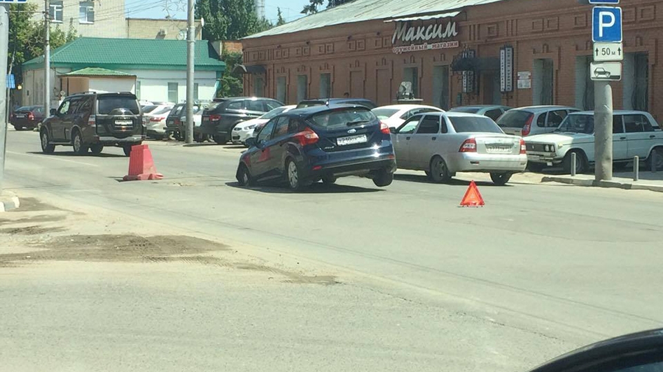 Саратовский автолюбитель прислал в редакцию ИА "Взгляд-инфо" фотографии сегодняшнего происшествия напротив оружейного магазина "Максим". На снимке видно, как в заделанный после вскрышных работ асфальт передним левым колесом провалился "Ford Focus".